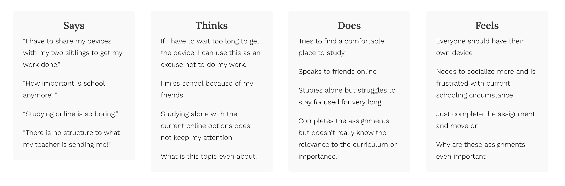 Firstly, we confirmed the hypotheses by conducting quantitative research and lead into qualitative research to identify the most accurate user persona. The major stakeholders are: students; teachers; parents; and government. Based on the limited information I can provide here, we will only focus on students. To help me in this task, I have extracted key interviewees’ insights and built a unique Empathy Map.